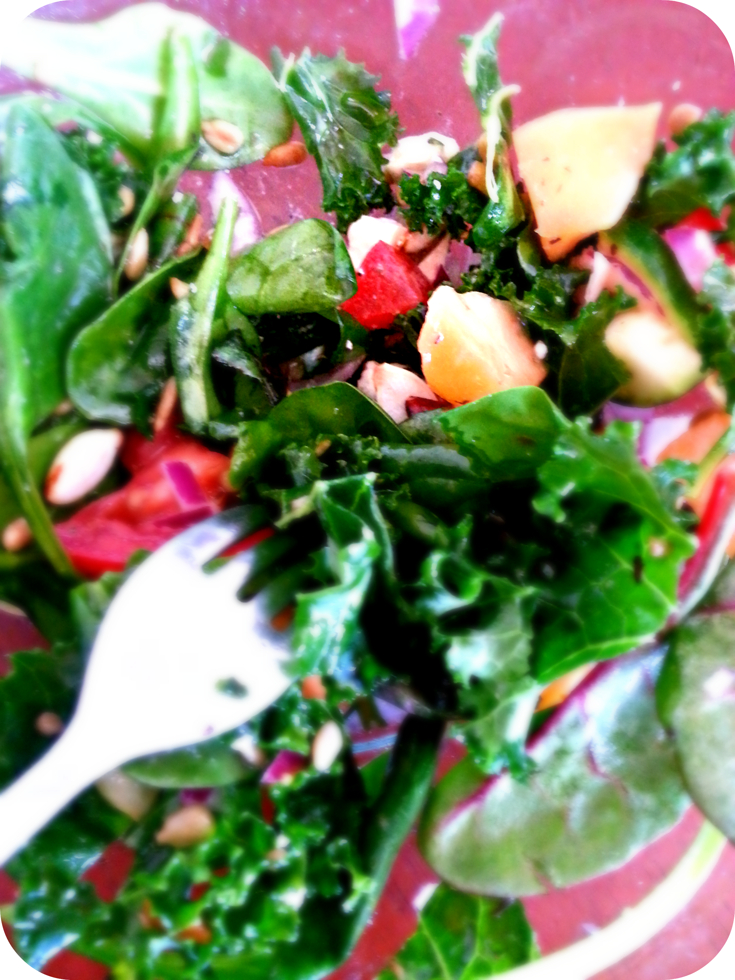 Dr. Oz explains adding about a handful of MUFA’s to each meal. Here I made a salad which consists of a little Extra Virgin Olive Oil, sunflower seeds, almonds and pumpkin seeds. Good fats mixed in with healthy greens.